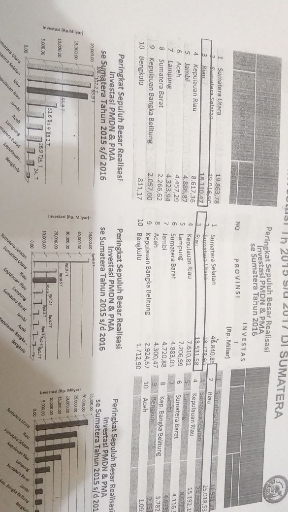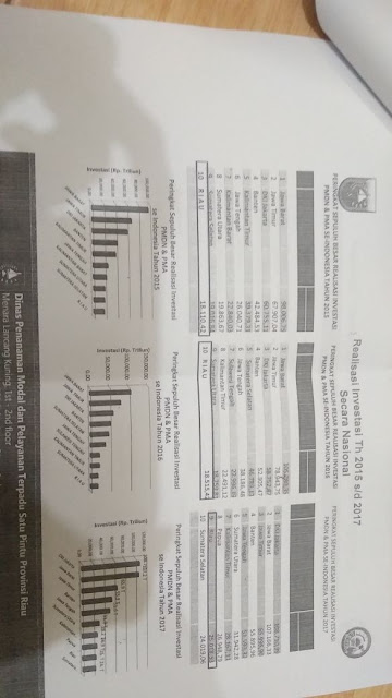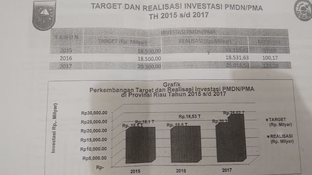 Realisasi Investasi PMDN dan PMA Tahun 2015 sampai Tahun 2017 secara Nasional, di tahun 2015 Provinsi Riau masuk 10 besar setelah Sumsel (Sumatra Selatan) dengan investasi Rp.18,110 triliun, tahun 2016 Provinsi Riau masuk 10 besar setelah Sumut ( Sumatra Utara) dengan investasi Rp.18,515 triliun, tahun 2017 Provinsi Riau masuk 9 besar dibawah Papua dengan investasi Rp.25,018 triliun, dengan kondisi bahwa sebenarnya RTRW belum Sah, sekitar Rp.53 Triliun yang terpending. Kalau seandainya tahun 2018 ini saja RTRW tersebut di Sah kan, kita masih punya stocknet untuk tahun ini punya Rp.23 triliun dari Target dan realisasi tahun 2018,ujarnya.