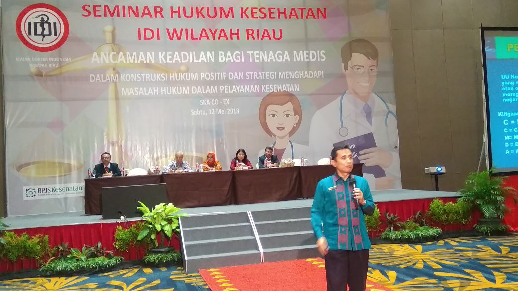 Pekanbaru, Homeriau.com - Seminar " IDI HUKUM KESEHATAN DI Wilayah Riau", yang Mana acara berlangsung di SKA CO-EX, dimulai jam 08.00-15.00 wib, (12/08/2018). Seminar yang membahas tentang memahamikan hukum positif dalam pelayanan kesehatan bagi tenaga medik, dan ancaman keadilannya. Selain itu, juga mengenalkan strategi menghadapi masalah hukum dalam pelayanan kesehatan serta yang terpenting, membangun persamaan persepsi diantara profesi dokter, profesi penegak hukum terkait penanganan kasus pelanggaran hukum tenaga medik.