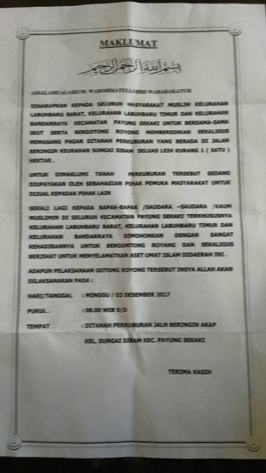 "Untuk dimaklumi tanah perkuburan tersebut sedang diupayakan sebahagian pemuka masyarakat untuk dijual ke pihak lain" seperti yang dikutip dalam selebaran Minggu, 3 Desember 2017.