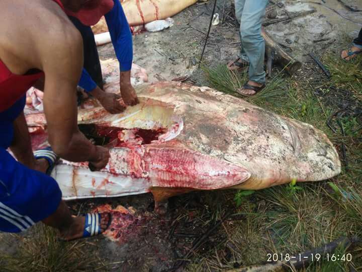 Diceritakan Iswandi, karena sudah mati dan tidak tau mau di kemanakan, solusi satu satunya, warga memotong hiu langka tersebut.