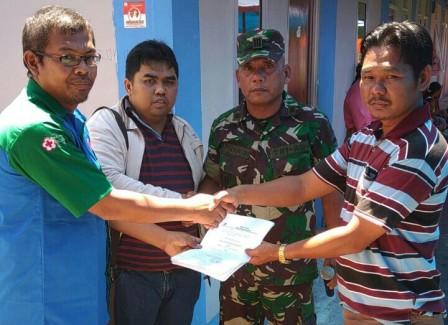 Ket Foto : Panitia untuk pengumpulan dana untuk Sinabung, Mulia Tarigan menyerahkan secara simbolis bantuan sembako kepada perwakilan warga sinabung.