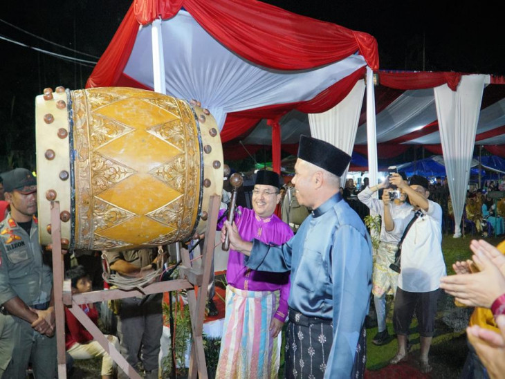 KAMPAR - Musabaqoh Tilawatil Qur'an (MTQ) ke - 52 Tingkat Kabupateb Kampar tahun 2023 resmi di buka secara langsung Pj Bupati Kampar Dr H Kamsol,MM, Senin malam (13/3/2023). Pembukaan yang ditandai dengan Pemukulan bedug dan diiringi dengan mars gemah qur'ani yang hiasi kembang api yang memancarkan warna warni di langit lapangan Pulau Payung.